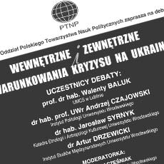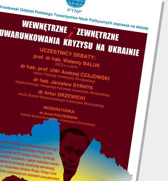 Plakat na debatę pt. „Wewnętrzne i zewnętrzne uwarunkowania kryzysu na Ukrainie”. Paneliści wyjaśnią dynamikę i konsekwencje politycznego kryzysu na Ukrainie...